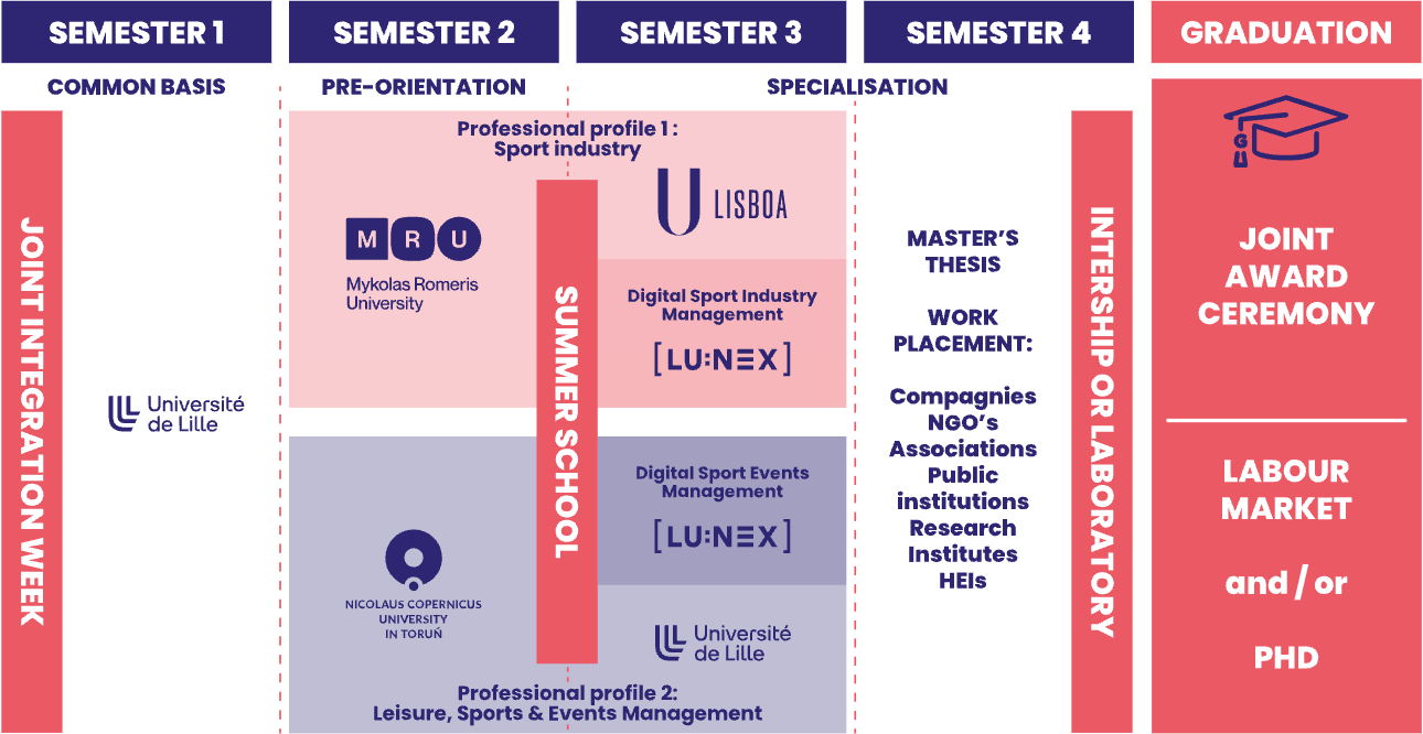 Following the first semester, students need to define their career plan and their mobility scheme: (1) Sport industry and (2) Leisure, Sport and Event management. Each track has a sub-programme dedicated to digitalisation, fitting with the labour market needs and future employment trends. The two tracks were elaborated in accordance with the academic specialisation of each university and the link of each partner with the professional environment.